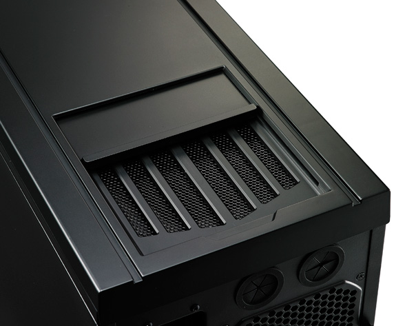 L’area interna è molto spaziosa e sufficiente a supportare 7+1 slot di espansione, che consentono di installare sistemi “enthusiast” che includono fino a 3 schede grafiche in configurazione SLI oppure Crossfire, un 3.5”/2.5” X-Dock Hot swappable e 7 bays per HDD.