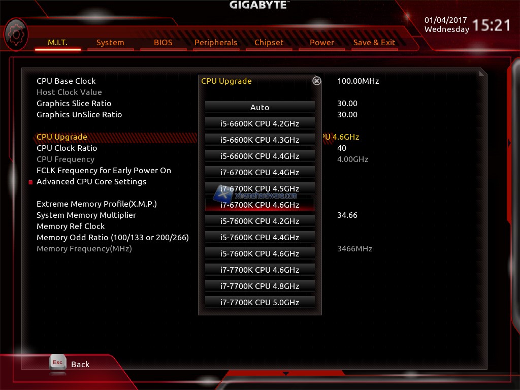 Navigando tra i Menù troveremo i classici Profili di Overclock preimpostati che ci garantiranno un Boot immediato alla frequenza desiderata. La massima frequenza preimpostata e valida al Boot disponibile sarà di 4.6 GHz per l’i7-6700K e ben 5 GHz per l’i7-7700K.