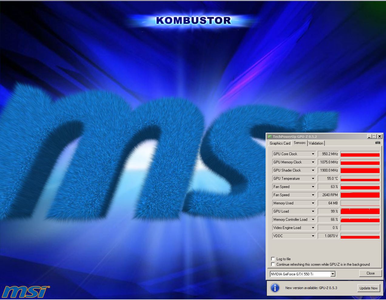 Per testare il sistema di dissipazione abbiamo utilizzato il programma MSI Konbustor, uno stress test molto efficace prodotto dalla stessa MSI, dopo circa mezz'ora di stress test le temperature si sono stabilizzate sui 55° e la ventola è arrivata a 2640 giri al minuto (63%) in questo caso il rumore inizia a farsi sentire.